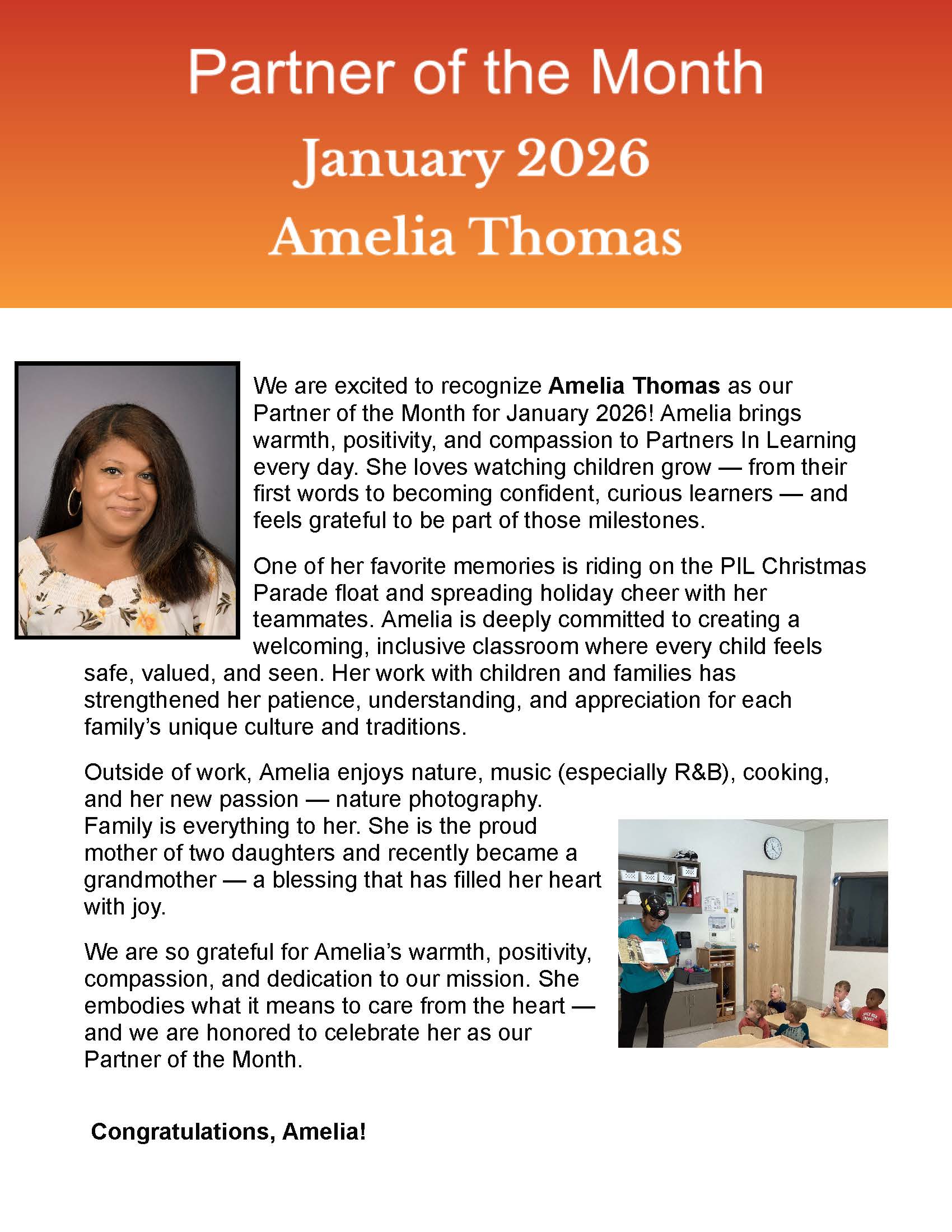 Partner Of The Month Amelia Thomas Flexible Assistant At The Woods Previous Partners June 2024 -Amy Vestal May 2024 -Tina Hoffman April 2024 -Diana Aldridge March 2024 -Dan Henderson February 2024 -Heather Fidler January 2024 -Erika Garmon December 2023 -Cassie Karriker October 2023 -Meliya Harris September 2023 -Nory Poole August 2023 -Suzanne Koontz July 2023 -Jeannie Anthony June 2023 -Megan McIntyre May 2023 -Mary Short About Us NAEYC Annual Report Board of Directors Leadership Team News Partner of the Month College/High School Internships Testimonials